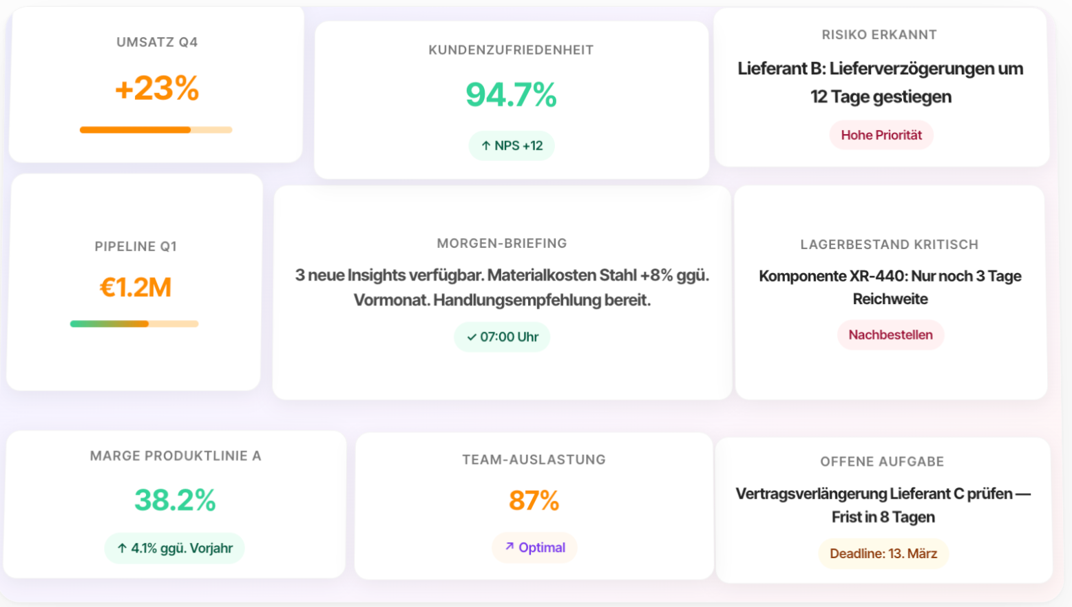Wie viel agiler und sicherer könnten Sie Ihr Unternehmen steuern, wenn Ihre Geschäfts-führung jederzeit Zugriff auf eine faktentreue, proaktive Wissens-basis hätte, die Trends erkennt, bevor sie zum Risiko werden?